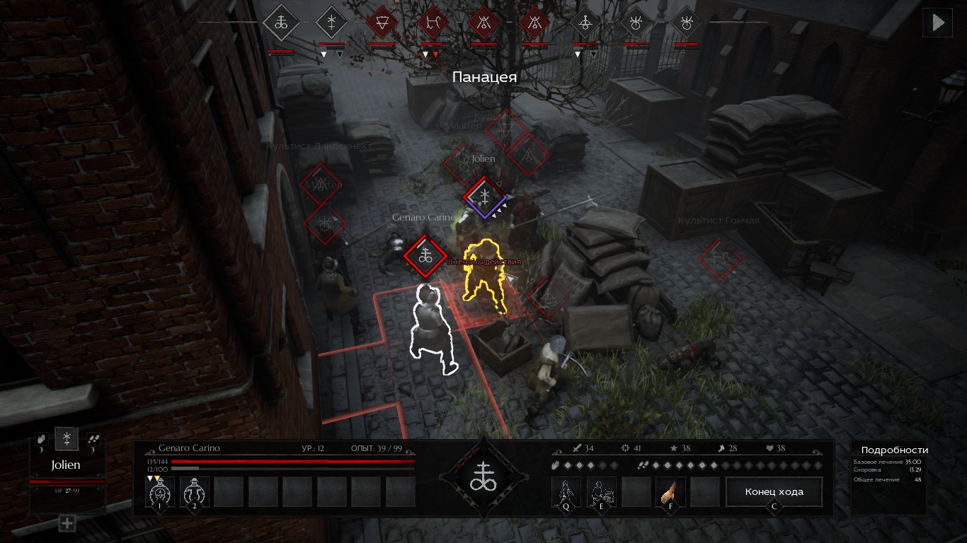 Помимо этого, атаки-способности накладывают на врага какой-нибудь отрицательный эффект, например, отравление, слепоту, кровотечение и т.п. Первый раз мой подчинённый погиб от эффекта кровотечения, которого я не заметил – оно снимает хитпоинты за каждую клетку, которую прошёл персонаж. Существуют также и небоевые способности, например, наёмник умеет перебинтовывать раны и восстанавливать немного хитпоинтов себе и другим, а алхимик может снимать гуморы со своих бойцов и восстанавливать хитпоинты в зависимости от числа гуморов.