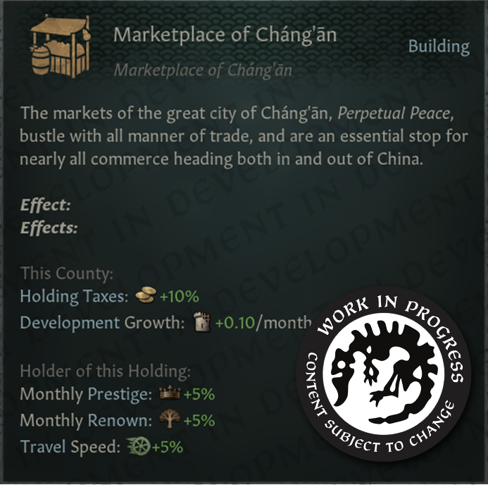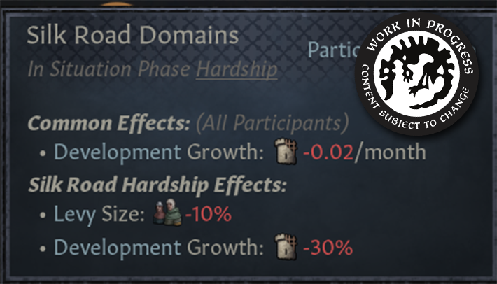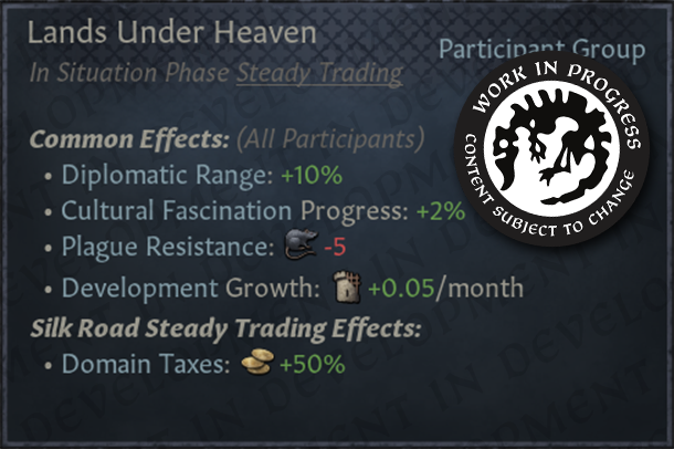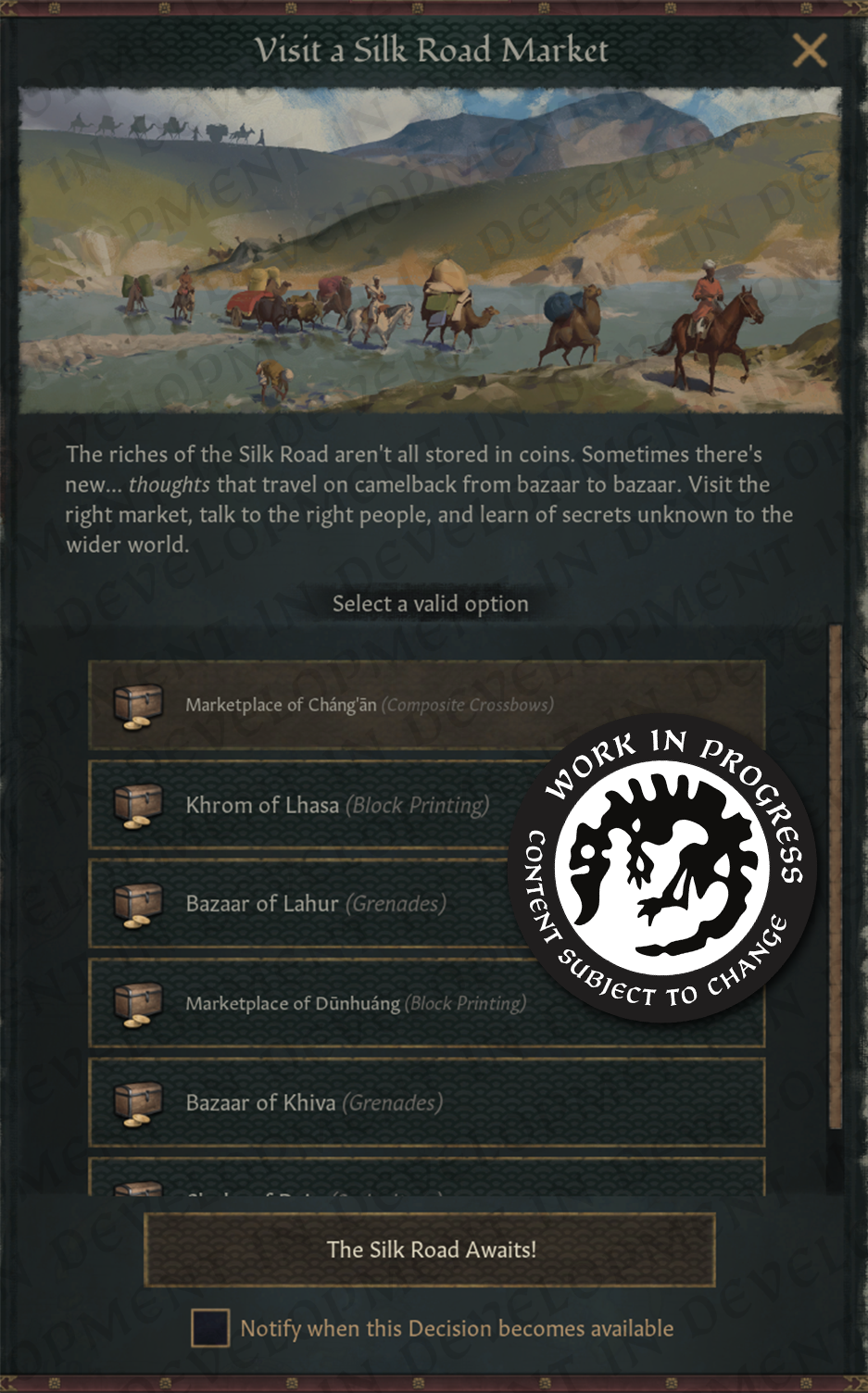 Хаб также является целевой точкой для решения «Посетить рынок Шёлкового пути». Заплатив золото, персонаж с достаточным уровнем навыков Образования и Управления сможет отправиться в хаб, чтобы изучить одну из уникальных инноваций и добавить её в список инноваций своей державы.