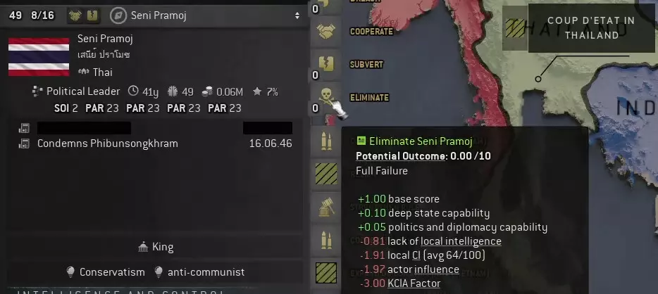 Таиланд на данный момент желает придерживаться статуса-кво. Его участие в новейшей истории довольно многогранно и включает в себя участие в оккупации Индокитая, поддержанное Японией. Кроме того, население Таиланда больше, чем у Индокитая, а сравнительно большая армия могут превратить Тай в полезного союзника в грядущей борьбе за выживание государства. Следовательно, мы направим туда наших самых опытных оперативников – подразделение под руководством Хо Трон Ба, чтобы устроить разведпункт в Бангкоке и затем внедриться для извлечения выгоды из местной политической обстановки.