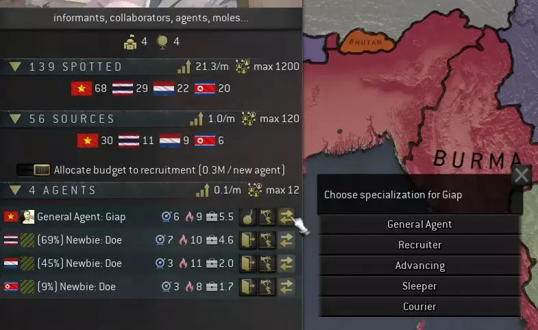 Один из них, агент по имени Гьяп – приближённый вьетнамского политика Чыонг Тиня, готов к специальному обучению. Так как мы поддерживаем связь с Тинем и не нуждаемся в особых ролях внутри страны (этим занимается внутренняя разведка), мы просто прикажем Гьяпу продвигаться по карьерной лестнице для будущей службы.