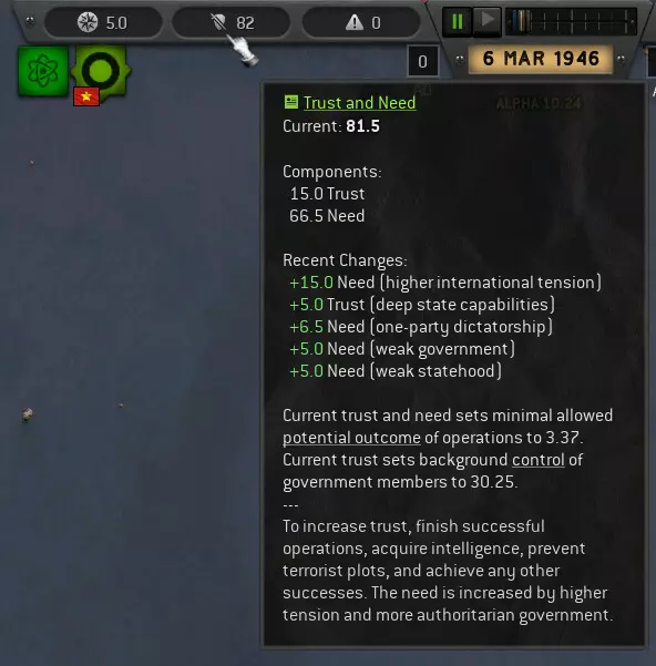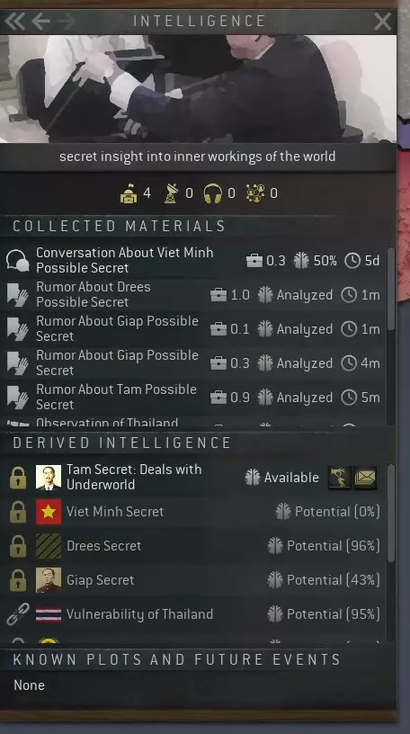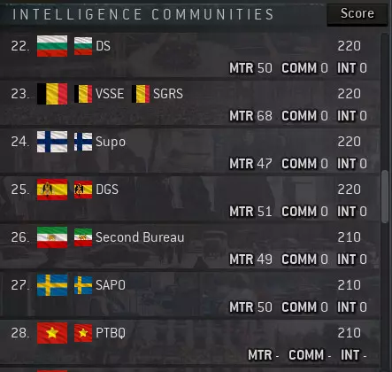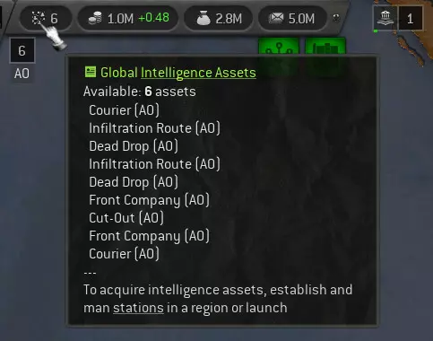 Есть множество других более малых ресурсов и параметров, влияющих на разведывательные операции (например, относительная сила валюты), с которыми вам только предстоит ознакомиться.