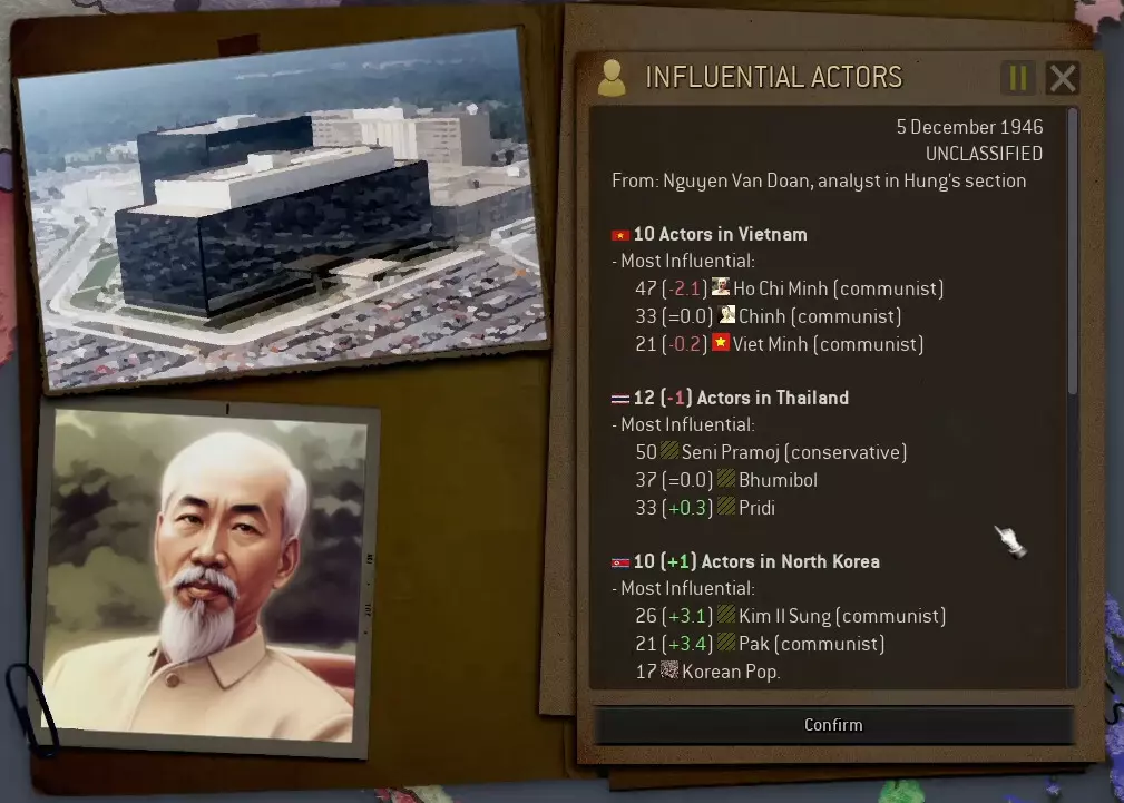 Во время между уходом японских оккупантов и возвратом французской колониальной администрации мы смогли выковать шаткую независимость, целиком зависящую от авторитета Хо Ши Мина. На внутреннем уровне ландшафт имеет определяющее влияние на нацию, взрощенную на партизанской борьбе. Её политики сильны в партизанском противостоянии, лидер – могущественный военачальник, всё ещё имеющий значительное влияние в подпольных организациях. Народ имеет довольно значимое влияние (из-за массового участия в войне). На международном уровне наше государство принадлежит к коммунистическому блоку, однако в 1946 году особого значения этот факт не имеет. Советский Союз зализывает раны после войны, соседствующий Китай разорван на части гражданской войной, а колониальные империи капиталистического блока держат всё ещё слишком большую армию, чтобы спокойно сидеть в Европе. Хо Ши Мин, осознавая угрозу, в данный момент обсуждает условия предоставления независимости в Париже. Он вернётся либо ни с чем (и французским вторжением), либо с вестью о частичной потере суверенитета. Последний вариант развития событий, впрочем, совсем не укладывается с истинной приверженностью коммунизму большей части важных акторов. Можно увидеть соответствующие примеры на территории колонии, от которой мы отделились.