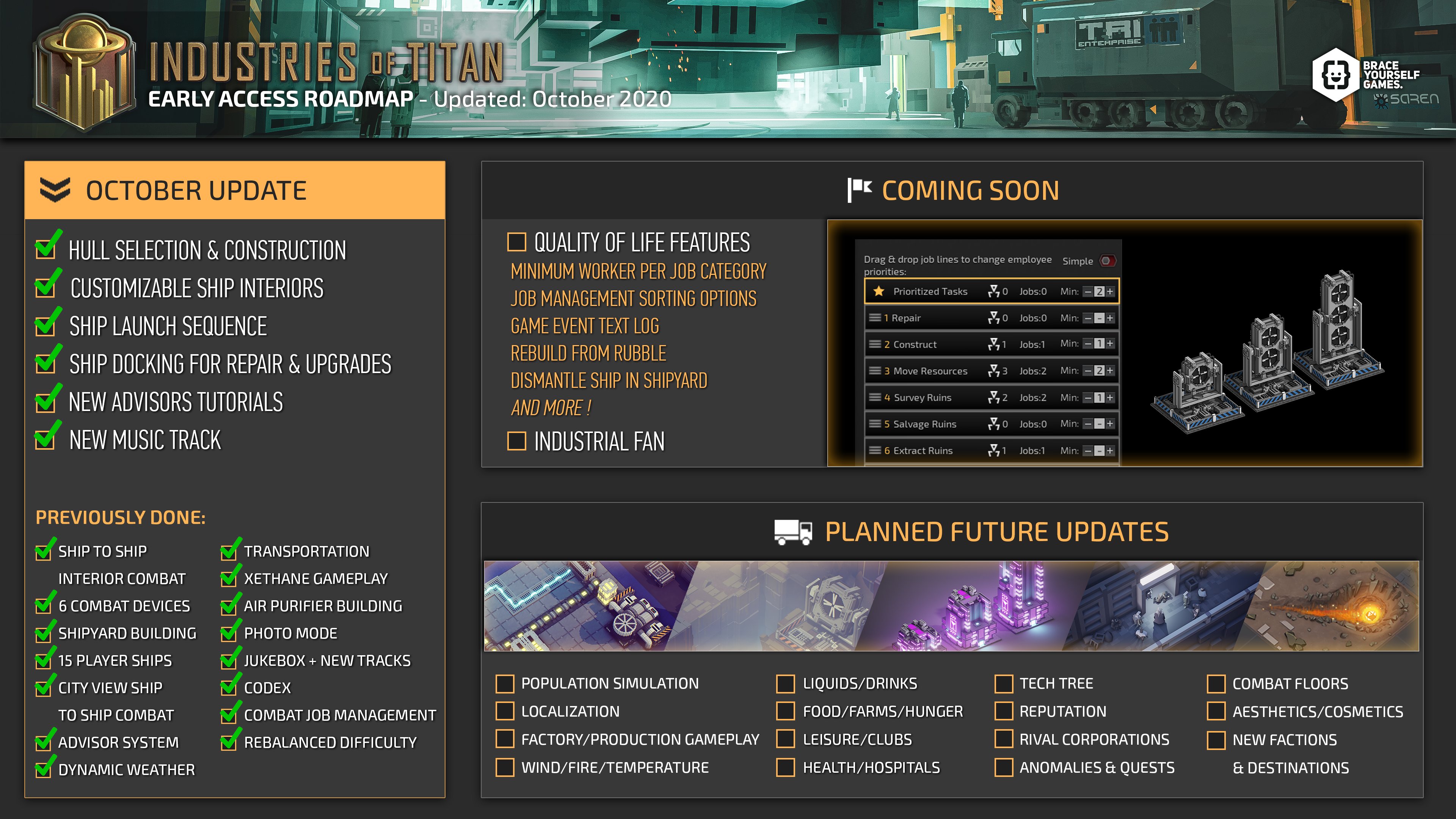Разработчики sci-fi стратегии Industries of Titan поделились результатами развития игры в раннем доступе. На инфографике ниже можно увидеть то, что уже было введено в игру, и то, что планируется. За 5 месяцев нахождения в раннем доступе студия Brace Yourself Games реализовала всё, что можно было увидеть в демо-версиях, которые были доступны ограниченное время.