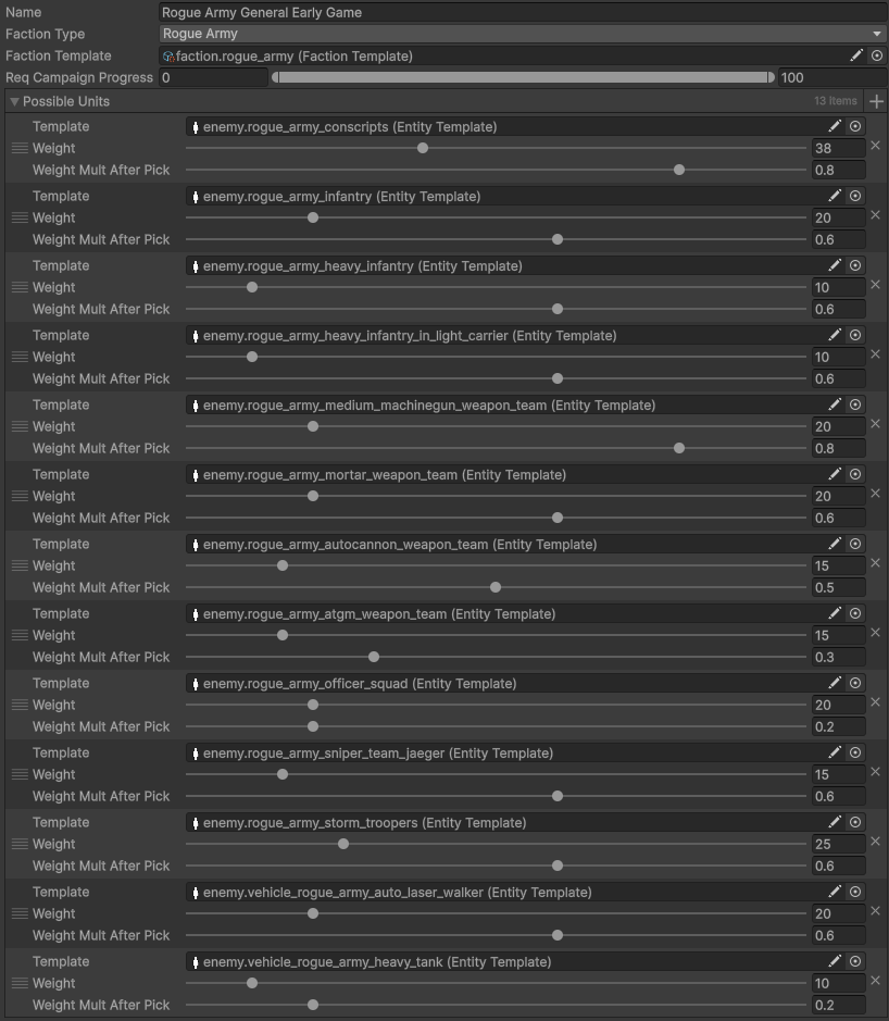 Решение: генерация армии врагов на основе веса и прогресса кампании игрока.